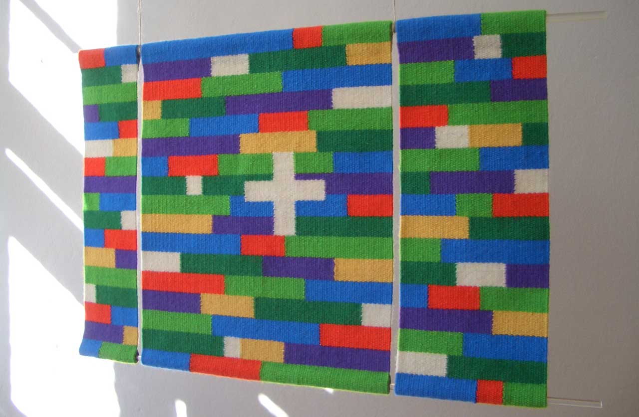 nach etwa 70 Jahren ihrer Anschaffung noch immer in Gebrauch waren, sprach für Ihre Qualität. Aber auch wenn die Stickerei noch in Takt war, hatten Garn und Gewebe inzwischen fast vollständig ihre Farben verloren. Es war Zeit für eine neue Garnitur eines Altar- und Kanzelbehangs. Gewünscht war das über Jahrzehnte hindurch vertraute biblische Bild des Weinstocks aus dem Johannesevangelium. Es gelang, der Gestaltung eine etwas zeitgemäßere Bildsprache zu geben. Als im Gottesdienst die alten und neuen Paramente nebeneinander präsentiert wurden, sorgte der Vorher-Nachher-Effekt bei allen Anwesenden für eine angenehme Überraschung.