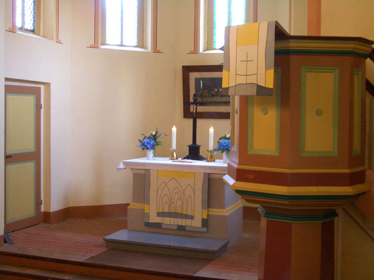 bei der u.a. auch ein neuer Altar des Künstlers Gottfried Zawadzki errichtet worden war, sind einige Jahrzehnte vergangen. Zusammengesetzt aus Holzbohlen, liegt die Mensa auf einem Stahlunterbau auf, dessen Form an tragende Hände erinnert.
