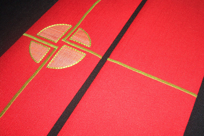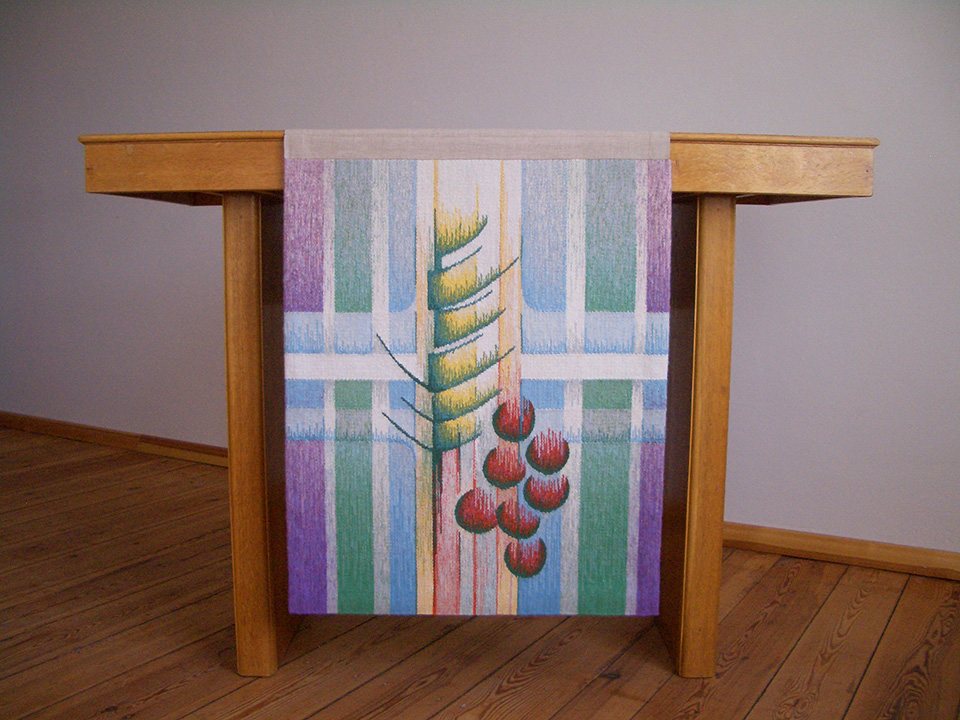 96 cm lang x 120 cm breit, Verpackungsfolien auf original Sandsack, genäht, entstanden nach der verheerenden Elbeflut 2002. Diese Arbeit kann zur Ausgestaltung von Gedenk, Mahn, Bitt- oder Dankgottesdienste ausgeliehen werden!